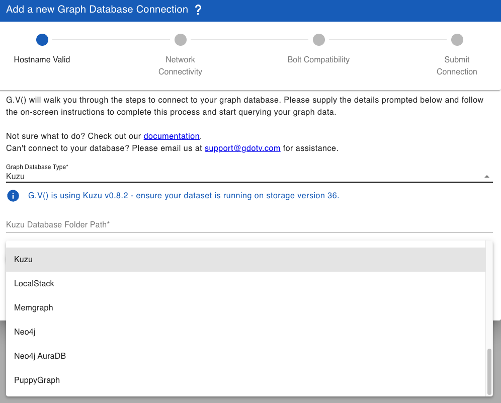 G.V() directly connects to a local Ladybug database. First, open the G.V() application and click on the “New Database Connection” button. You can select Ladybug from the list of supported databases as shown below.