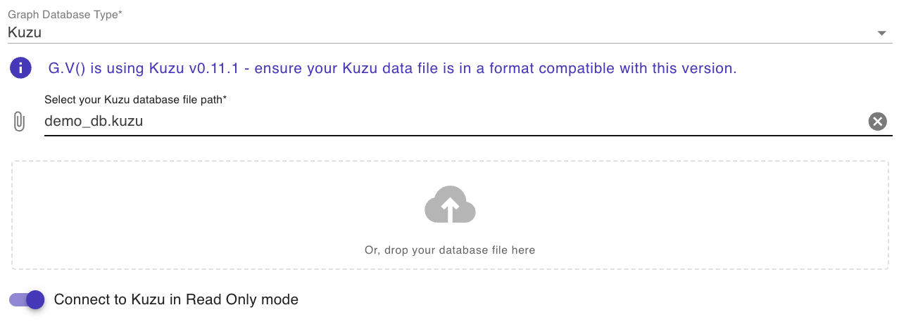 The next step is to point G.V() to the Ladybug database you want to connect to. To do this, either click on the empty path selector, or drag-drop your Ladybug database file into the UI. By default, G.V() will try to connect to the Ladybug database in read-write mode. If you want it to connect in read-only mode, you can select the “Read Only” button shown. Once selected, you can click on “Test Connection” to make sure that the connection is successful.