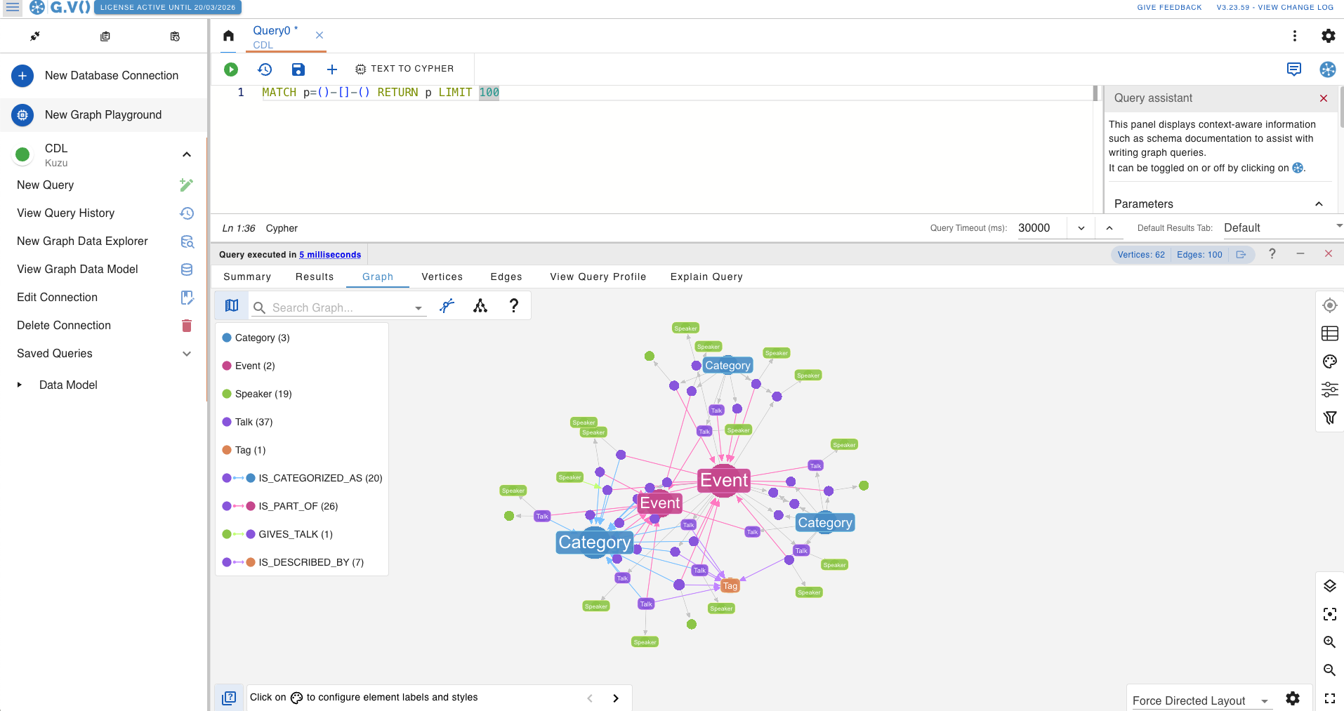 You’re now ready to write and execute Cypher queries in G.V()! The default query is loaded in the query editor, which can be executed by clicking on the “Play” button or pressing Ctrl+Enter (or Cmd+Enter on macOS). You should see your graph data visualized in the main panel.