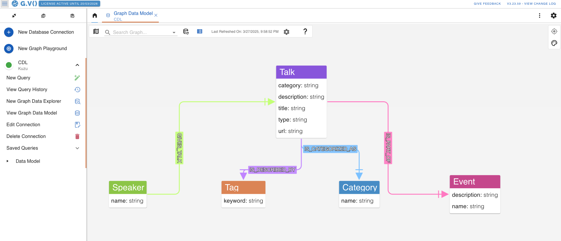 You can view the graph schema by clicking on the “View Graph Data Model” button in the left sidebar. This displays the graph schema in a convenient layout that shows the node labels, relationship labels and their associated properties (and their data types).